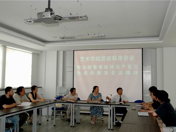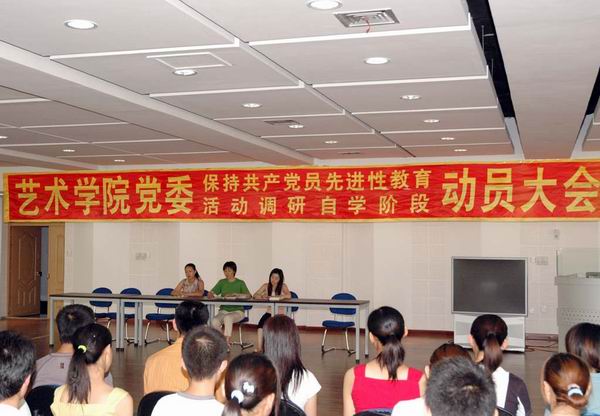 2005年7月13日下午4點藝術(shù)學(xué)院召開黨政聯(lián)席會議,傳達貫徹落實校黨委保持共產(chǎn)黨員先進性教育活動調(diào)研自學(xué)階段的動員大會精神。首先由黨委副書記佟海棠傳達了會議精神,學(xué)習(xí)了曾慶紅、賀國強同志在保持共產(chǎn)黨員先進性教育工作會議上的講話精神。