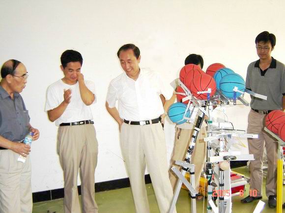 唱江華校長(zhǎng)認(rèn)真地觀看了我校同學(xué)研制的參賽機(jī)器人的模擬表演,并就有關(guān)問題與計(jì)算機(jī)與控制工程學(xué)院院長(zhǎng)戴學(xué)豐等指導(dǎo)教師和參賽同學(xué)交換了意見。唱江華校長(zhǎng)關(guān)切地詢問參賽師生的學(xué)習(xí)和生活,親切地與參賽同學(xué)進(jìn)行交談,并代表學(xué)校對(duì)他們表示親切的慰問。他勉勵(lì)參賽師生在比賽中取得優(yōu)異賽績(jī),為校爭(zhēng)光。