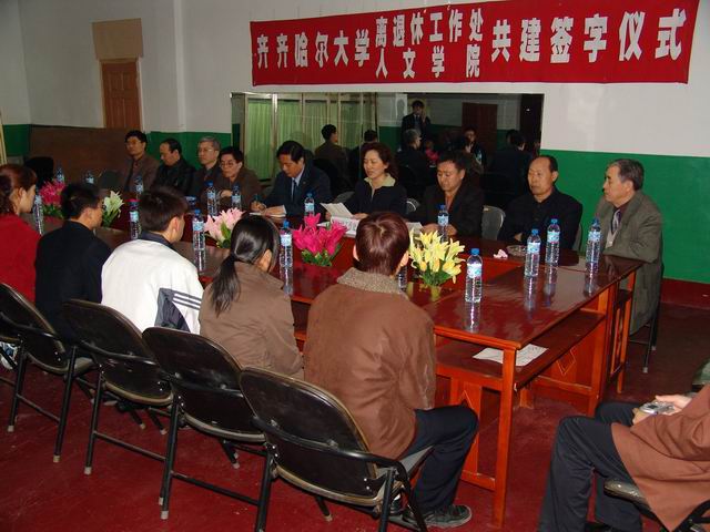 簽字儀式由離退休工作處副處長、黨委副書記王志剛主持。人文學(xué)院黨委書記卜春江、院長王則遠(yuǎn),院黨委副書記、副院長張振民和副院長姜波、離退休工作處副處長、黨委書記韓樹勤,離退休老干部代表、?!瓣P(guān)工委”副主任劉禎和薛秉昌,人文學(xué)院學(xué)生代表等參加。
