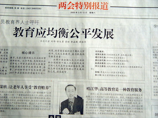 圍繞非義務(wù)教育投入問(wèn)題,唱江華校長(zhǎng)在黑龍江省代表團(tuán)舉行的第一次全體會(huì)議上做了發(fā)言。他建議,非義務(wù)教育階段助學(xué)貸款和特困生的補(bǔ)助應(yīng)由中央政府、地方政府共同投資,由民政部門(mén)在學(xué)生入學(xué)前做好貸款或補(bǔ)助認(rèn)定。2005年3月6日的《黑龍江日?qǐng)?bào)》予以了報(bào)道。