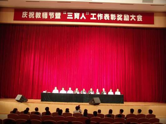 校黨委書記陳承貴主持了大會(huì)。會(huì)議開始時(shí),全體起立,奏國(guó)歌;整個(gè)會(huì)場(chǎng)莊重?zé)崃遥笠缰?jié)日的氣氛。 校黨委副書記史鐵成宣讀了學(xué)校黨委《關(guān)于命名表彰“三育人”標(biāo)兵 先進(jìn)個(gè)人和先進(jìn)集體的決定》。人文學(xué)院等7個(gè)單位榮獲了“三育人”先進(jìn)集體;賈麗華等6人榮獲了“三育人”標(biāo)兵;趙家林等94人榮獲“三育人”先進(jìn)個(gè)人。學(xué)校領(lǐng)導(dǎo)為獲獎(jiǎng)集體和個(gè)人代表頒了獎(jiǎng)。學(xué)生代表、校學(xué)生會(huì)主席王楊同學(xué)代表全體在校生向全體教師表達(dá)了節(jié)日的祝福,發(fā)出了廣大莘莘學(xué)子對(duì)人民教師無限尊敬的心聲?!叭恕睒?biāo)兵代表,輕紡學(xué)院劉鐵山副教授代表全體教師發(fā)言,感謝黨和國(guó)家及學(xué)校對(duì)教師的關(guān)懷和鼓勵(lì),表達(dá)了全體教師用“愛與責(zé)任”鑄“師德之魂”的節(jié)日感言。