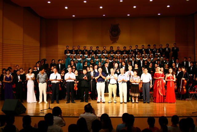 音樂(lè)會(huì)結(jié)束后,省、市領(lǐng)導(dǎo)登臺(tái)向演員們表示慰問(wèn)并合影。