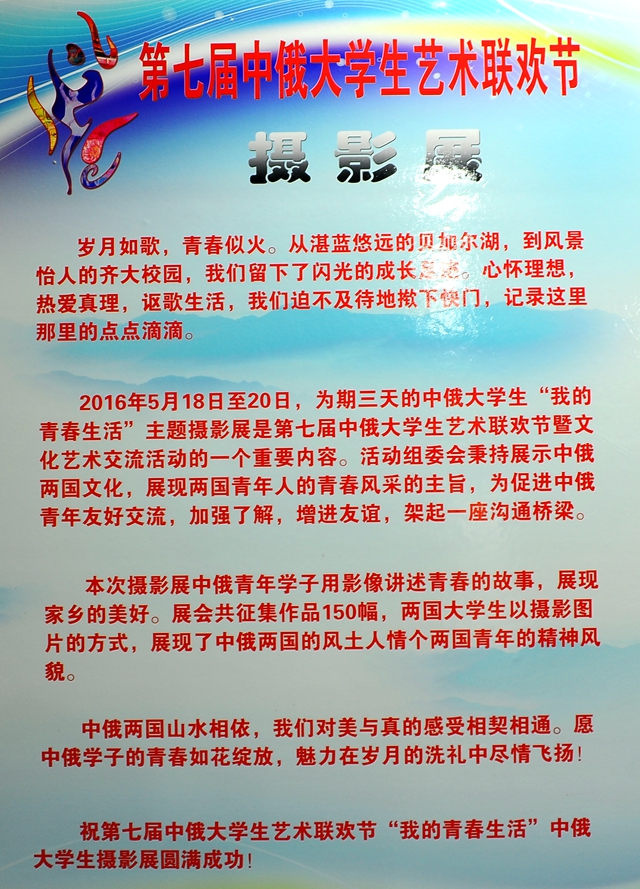 中俄大學(xué)生攝影作品展以“我的青春生活”為主題,共展出150幅作品,用影像講述自己的青春生活,通過兩國青年學(xué)生的視角,生動(dòng)記錄了中俄兩國的風(fēng)土人情和中俄兩國青年的精神風(fēng)貌,進(jìn)一步拉近了中俄兩國青年大學(xué)生的距離,增進(jìn)了彼此之間的了解,傳承了中俄兩國人民之間代代相傳的友誼,為中俄傳統(tǒng)友誼注入新鮮活力。我們希望并且相信,中俄兩國青年人以藝術(shù)聯(lián)歡為載體,攜手并肩,繼往開來,在筑夢和平的“一帶一路”上讓中俄友誼薪火相傳。