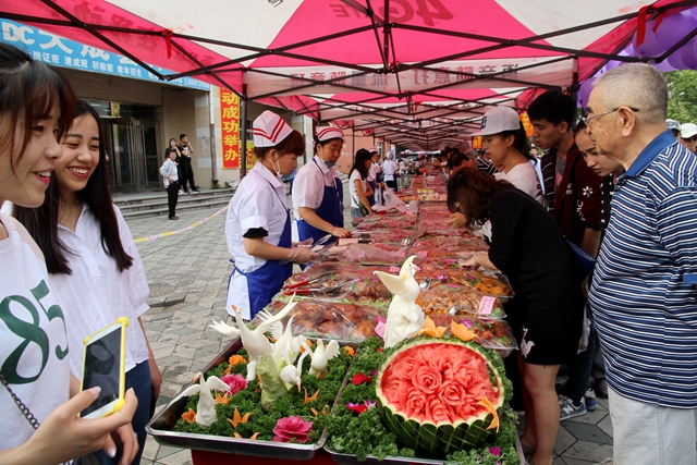 民以食為天,食以安為先。本次食品展銷的食品均是各食堂親自加工制作的,食品來源安全、可靠,飲料、水果展銷商也是具有食品安全和營業(yè)資質(zhì)的商家。活動現(xiàn)場,遮陽傘架下,來自學生一至八食堂的美食展銷單位依次排列,展臺上擺滿了特色繁多的美食精品,各食堂師傅紛紛亮出自己的絕活,龍鳳呈祥、孔雀開屏、松鶴延年、天降祥龍等精美食材雕刻讓在場的人們驚嘆不已。300余種主副食品芳香四溢、五味俱全:烤全羊味道十足、特色烤串兒香飄十里、紅燒肉油而不膩 、炸雞翅香脆質(zhì)嫩、板粟雞塊咸甜適中、麻辣鱈魚麻辣鮮香、糖醋排骨酸甜可口、美味香春卷鮮美甘脆、水果沙拉清爽多汁、豆沙涼糕香甜軟糯……現(xiàn)場師生和市民紛紛拿出手機、相機進行拍照并第一時間利用微信、微博等新媒體發(fā)到朋友圈,曬美食樂事,表達愉悅心情,一時間人們紛紛在網(wǎng)上為學校食堂廚師的精湛廚藝點贊。美食展銷,蜚聲校園內(nèi)外,贏得一片點贊。