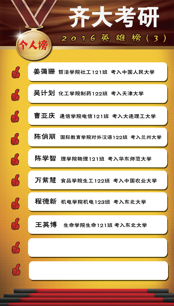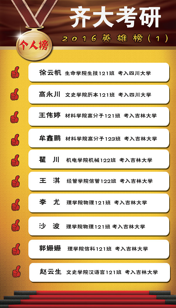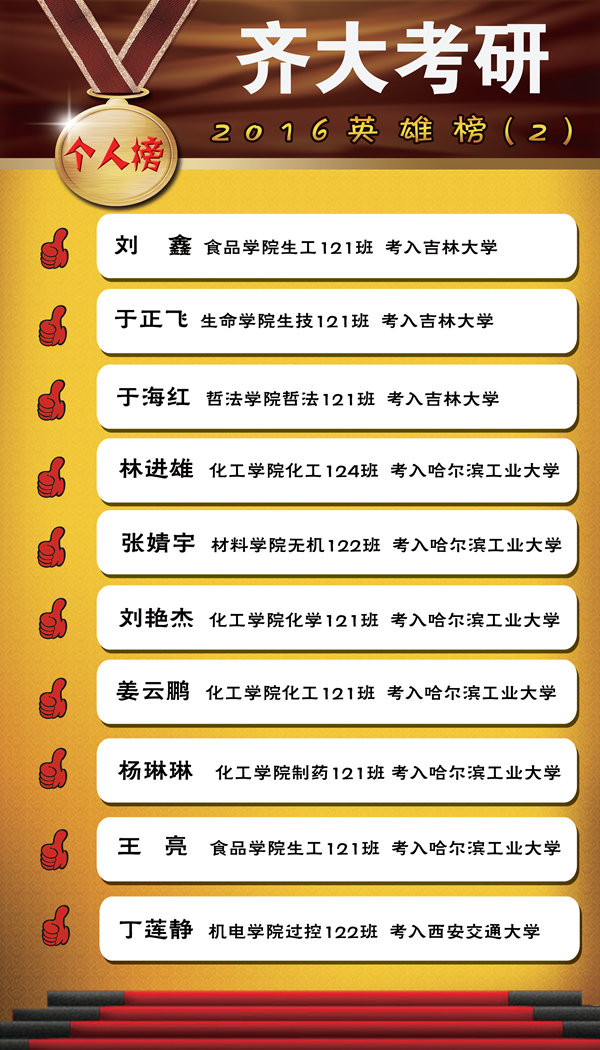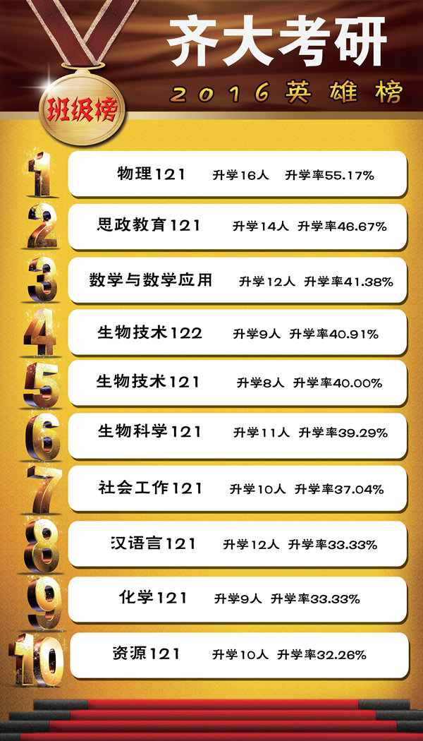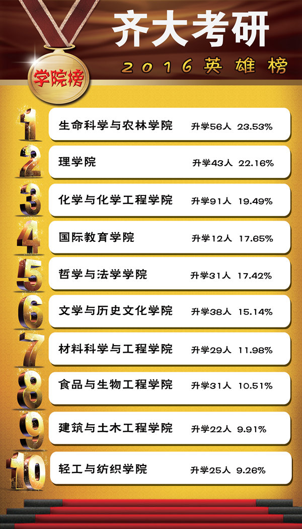 以下是2016年的學(xué)院考研率前十名、班級考研率前十名以及考入“985工程”院校的學(xué)生名單。