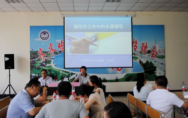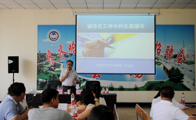 按照《齊齊哈爾大學(xué)就業(yè)指導(dǎo)處2016年工作計(jì)劃》的整體安排,為落實(shí)“就業(yè)質(zhì)量加強(qiáng)年”工作任務(wù),全面提高我校職業(yè)生涯規(guī)劃和就業(yè)指導(dǎo)教師隊(duì)伍的職業(yè)化、專業(yè)化、專家化水平,7月9日,北京師范大學(xué)心理學(xué)院喬志宏教授應(yīng)邀來校作“輔導(dǎo)員工作中的生涯輔導(dǎo)”專題講座。校黨委常委、常務(wù)副校長鄭喜群教授與喬志宏教授親切會(huì)談,并與全體參會(huì)教師合影留念。我校就業(yè)指導(dǎo)處全體教師、20個(gè)學(xué)院主管學(xué)生工作副書記、副院長及輔導(dǎo)員90余人聆聽了講座。