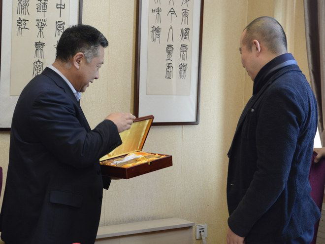 校長馬立群在講座之前與牟克見面并進(jìn)行了交流,對他所取得的藝術(shù)成就給與了高度贊揚(yáng),同時希望他能夠利用俄羅斯高水平的藝術(shù)交流平臺,為母校藝術(shù)學(xué)科和專業(yè)建設(shè)作出貢獻(xiàn);牟克表示,非常感謝母校的培養(yǎng),一定要盡自己最大努力回報母校。馬立群向牟克贈送了校慶紀(jì)念品《大學(xué)賦》。