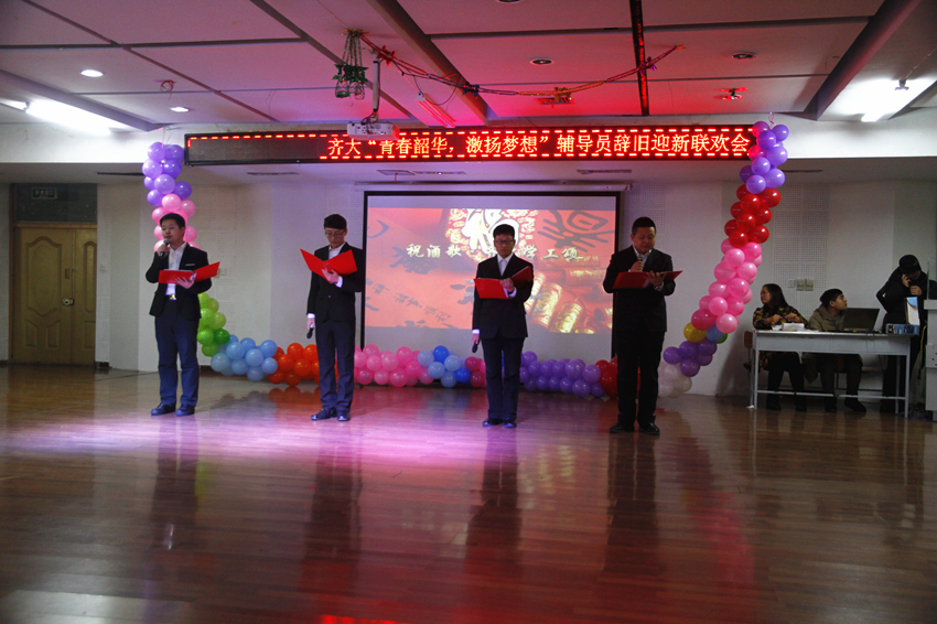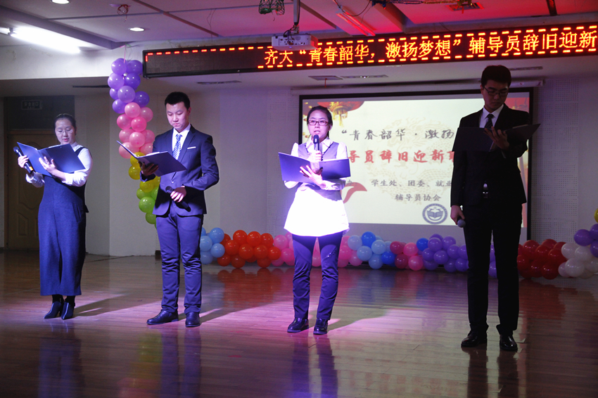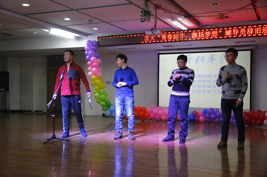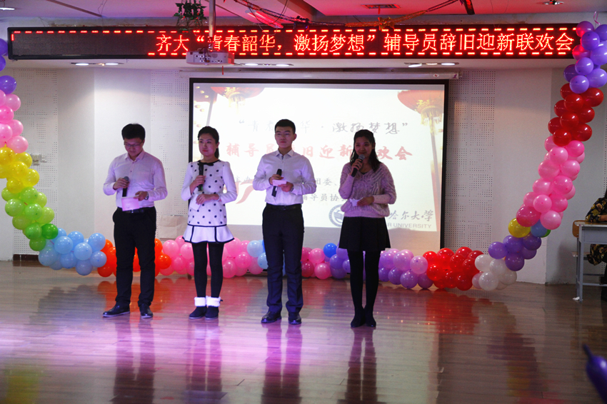 聯(lián)歡晚會由通信與電子工程學(xué)院輔導(dǎo)員李興濤、化學(xué)與化學(xué)工程學(xué)院輔導(dǎo)員路藝、外國語學(xué)院輔導(dǎo)員郭雪冬、機(jī)電工程學(xué)院輔導(dǎo)員龐曉遠(yuǎn)四人聯(lián)袂主持。