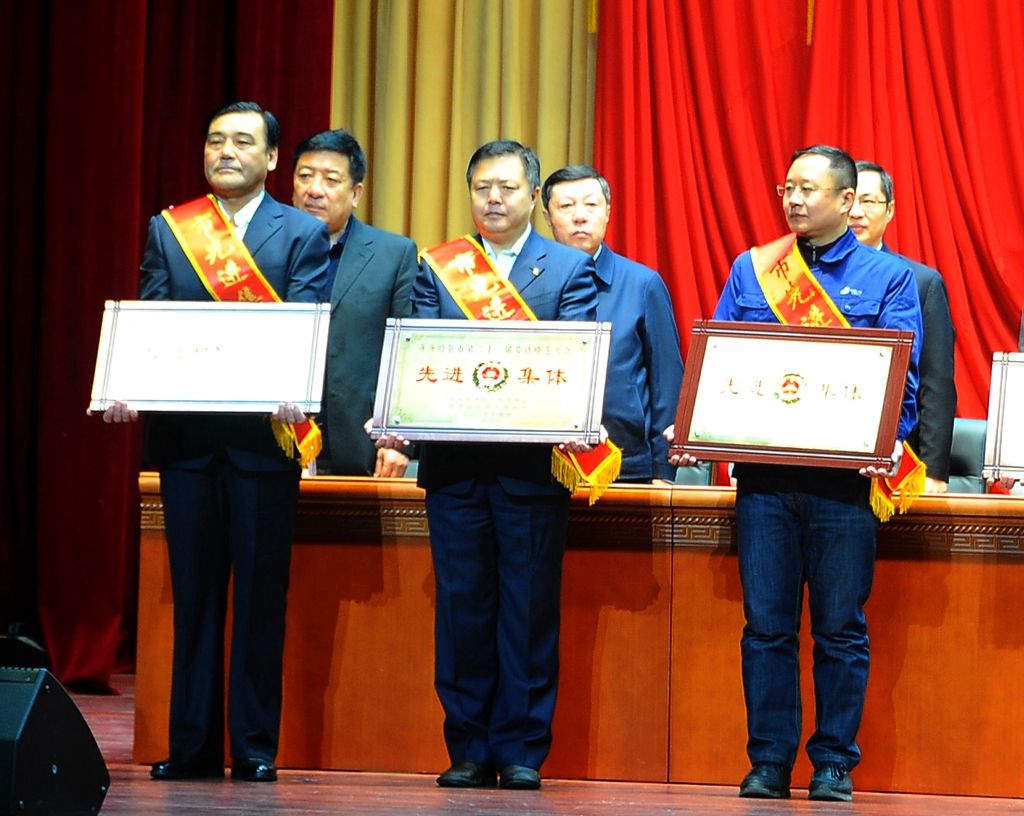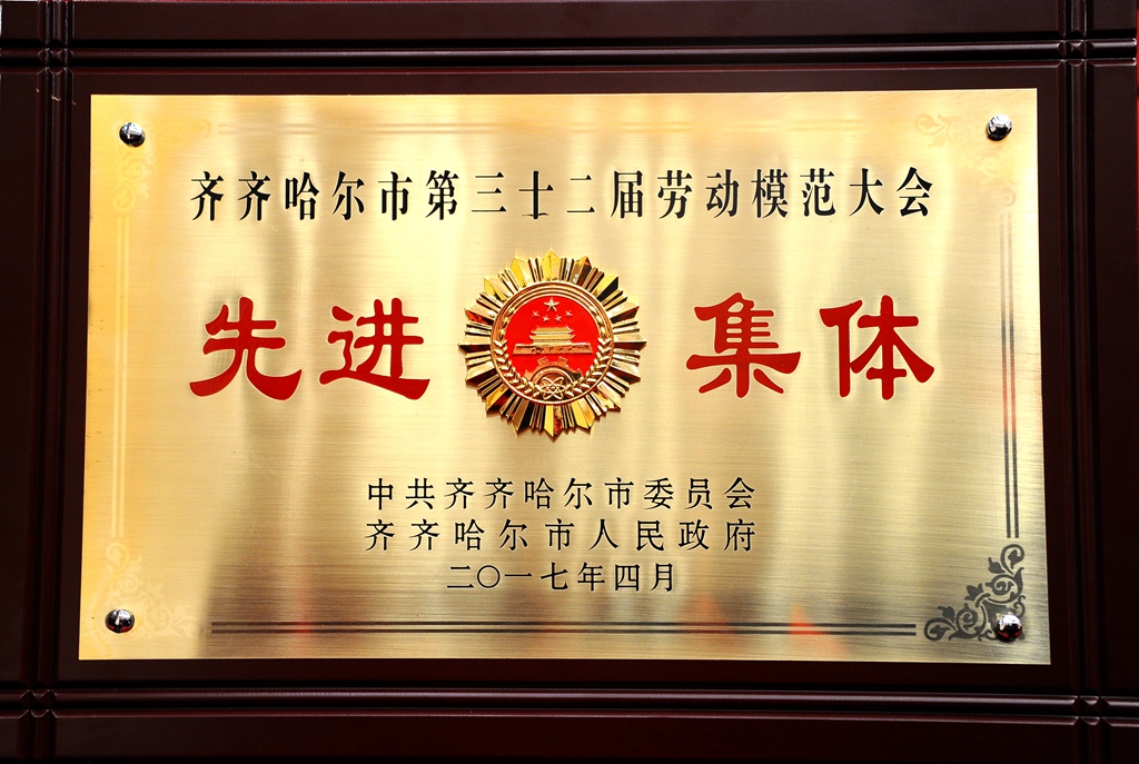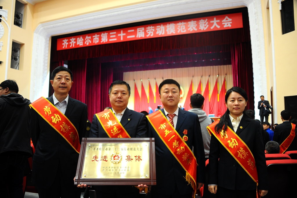 在勞動模范表彰大會上,我??萍继幐碧庨L伊全勝代表我??萍继幧吓_領(lǐng)取“齊齊哈爾市第三十二屆勞動模范表彰大會先進(jìn)集體”獎牌。