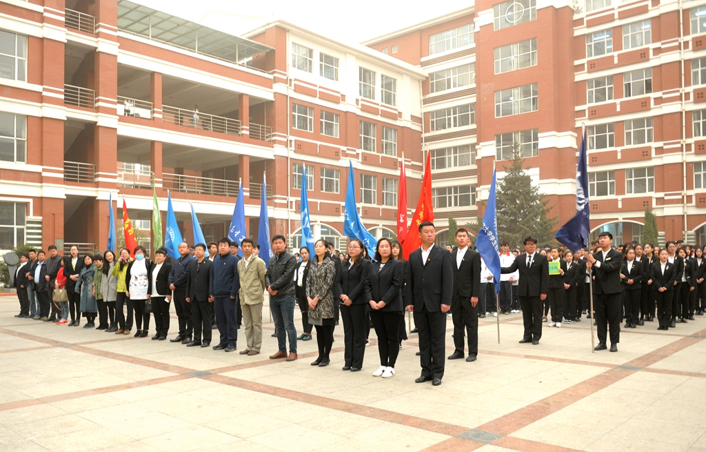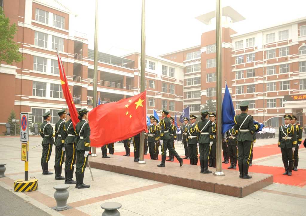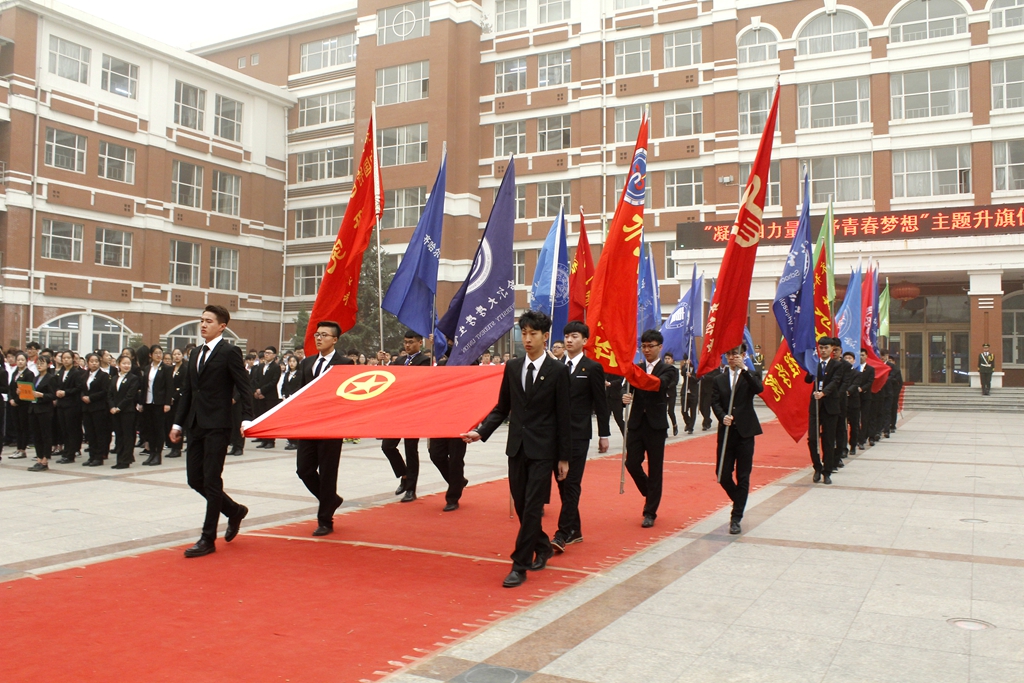 “凝五四力量,抒青春夢想”主題升旗儀式活動開始,全體肅立,出國旗、校旗,升國旗、校旗,唱國歌、校歌。