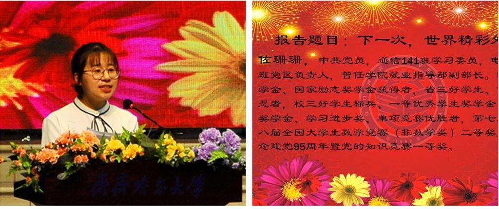 此次報(bào)告團(tuán)成員中有綜合成績(jī)優(yōu)異、學(xué)習(xí)能力突出的學(xué)習(xí)標(biāo)兵;有自立自強(qiáng)、在逆境中迎難而上的自強(qiáng)之星;有在學(xué)科競(jìng)賽、社會(huì)實(shí)踐等方面表現(xiàn)突出的單項(xiàng)先鋒;還有在各類志愿服務(wù)和社會(huì)公益活動(dòng)中作出杰出貢獻(xiàn)的志愿明星。他們都是綜合能力強(qiáng)、善于總結(jié)、善于分享的杰出在校學(xué)生代表。他們結(jié)合自己在學(xué)習(xí)生活中的親身體驗(yàn),用生動(dòng)的語(yǔ)言,飽含深情地介紹了自己大學(xué)期間的感人事跡和成長(zhǎng)成才的奮斗歷程,向?qū)W弟學(xué)妹們展現(xiàn)了豐富多彩的大學(xué)生活。
