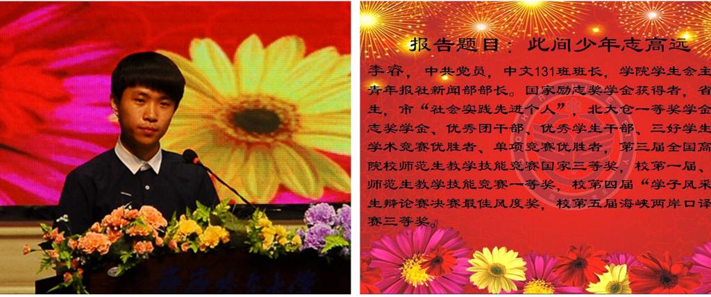 為展現(xiàn)我校優(yōu)秀學(xué)子風(fēng)采,引領(lǐng)校園文化方向,激勵(lì)同學(xué)們勤奮學(xué)習(xí),積極進(jìn)取,感恩勵(lì)志,學(xué)校開展了第三屆“感恩?勵(lì)志?成才”先進(jìn)事跡報(bào)告團(tuán)巡講活動(dòng)。學(xué)生工作部(學(xué)生處)精心組織,經(jīng)過(guò)各學(xué)院選拔、推薦,學(xué)??疾臁⒊踹x、復(fù)選等程序,化學(xué)與化學(xué)工程學(xué)院王書晴等10名同學(xué)成為我校“感恩?勵(lì)志?成才”先進(jìn)事跡報(bào)告團(tuán)成員。