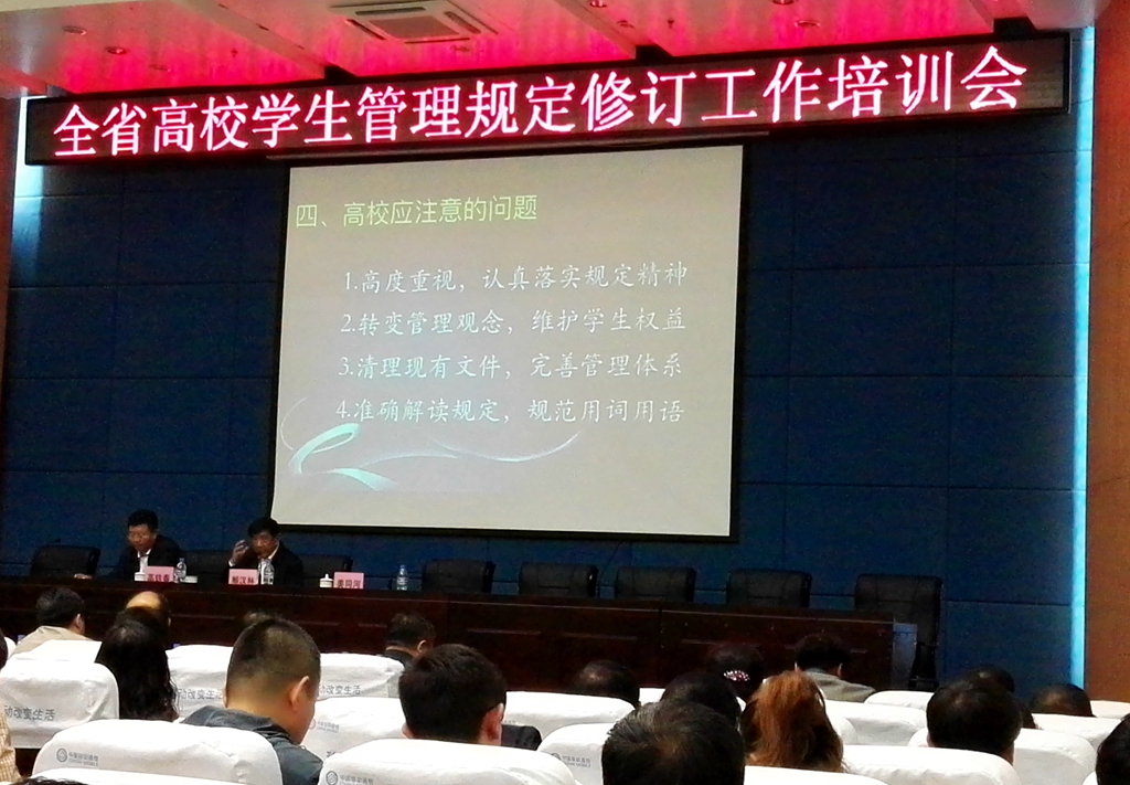 會議由省教育廳高校學(xué)生處處長高鐵春主持,省教育廳黨組成員、副廳長姜同河就文件修訂工作做出重要指示,教育部高校學(xué)生司學(xué)籍管理處處長解漢林對《普通高等學(xué)校學(xué)生管理規(guī)定》(教育部令第41號)進行了深入解讀。
