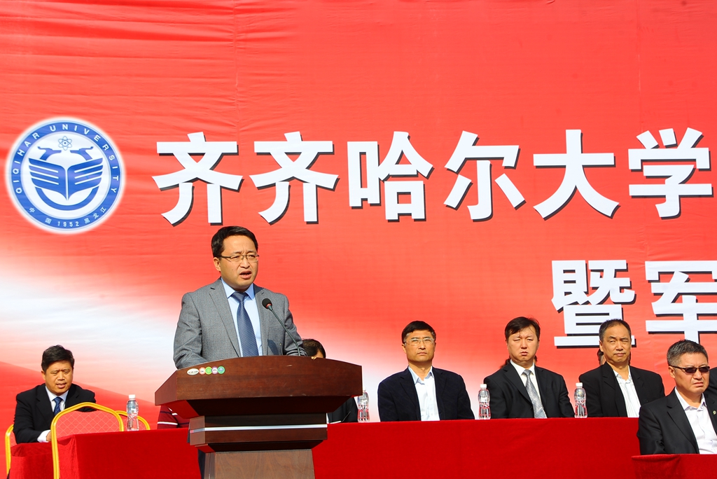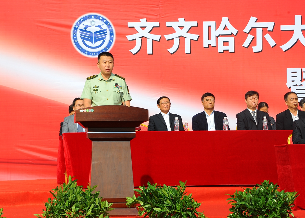 武警齊齊哈爾支隊(duì)副參謀長(zhǎng)韓劍飛中校代表武警齊齊哈爾支隊(duì)的全體官兵對(duì)參加軍訓(xùn)工作的老師、學(xué)生以及全體教官表示親切的問(wèn)候!他表示,齊齊哈爾大學(xué)和武警齊齊哈爾支隊(duì)是共建單位。幾年來(lái),我們親眼見證了齊齊哈爾大學(xué)輝煌的建設(shè)成就。齊齊哈爾大學(xué)舉行這次軍訓(xùn),是全面貫徹黨的教育方針和國(guó)防教育法、推進(jìn)素質(zhì)教育的重要舉措,是同學(xué)們學(xué)習(xí)軍隊(duì)優(yōu)良傳統(tǒng)、培養(yǎng)艱苦奮斗精神的良好機(jī)會(huì),希望同學(xué)們一定要珍惜軍訓(xùn)機(jī)會(huì),高標(biāo)準(zhǔn)、高質(zhì)量、安全順利地完成軍訓(xùn)任務(wù),超越自我,不斷前進(jìn),讓青春年華在未來(lái)的征途中放射出燦爛奪目的光彩!