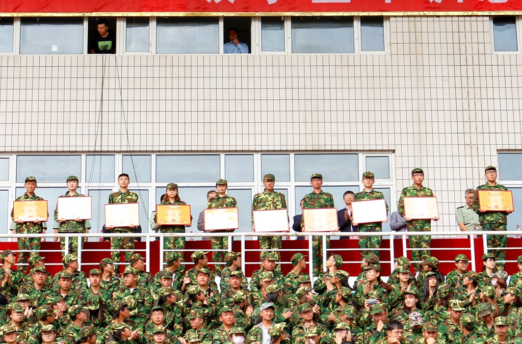 先進營代表、組織獎代表,先進連代表、隊列匯操優(yōu)勝連、內(nèi)務(wù)衛(wèi)生評比優(yōu)勝連代表上臺領(lǐng)獎,與會軍訓(xùn)團成員分別為他們頒獎。