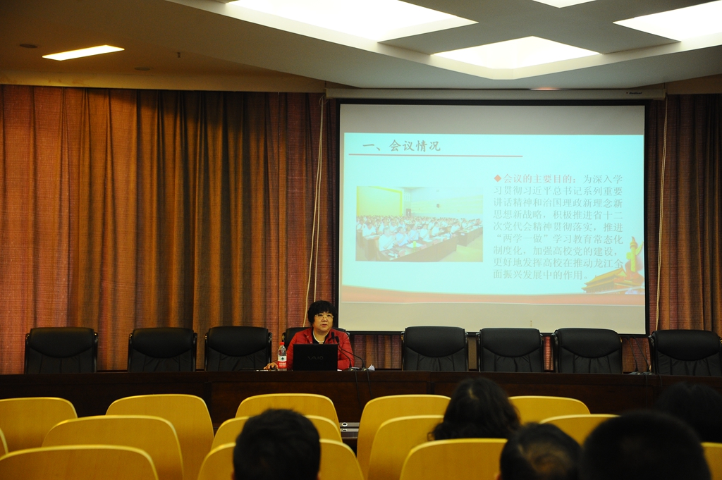 會(huì)上,校黨委宣傳統(tǒng)戰(zhàn)部部長王曉梅作了題為《學(xué)習(xí)張慶偉書記在全省高校暑期書記校長研討班上的講話》的報(bào)告。她從“強(qiáng)化思想武裝,始終保持政治上的堅(jiān)定自覺”、“認(rèn)清形勢(shì)任務(wù),主動(dòng)融入全面振興龍江發(fā)展大局”、“堅(jiān)持立德樹人,切實(shí)加強(qiáng)高校思想政治工作”和“從嚴(yán)管黨治黨,營造風(fēng)清氣正的高校政治生態(tài)”等4個(gè)方面,對(duì)省委書記張慶偉在全省高校2017年暑期書記校長研討班上的講話精神進(jìn)行了全面、詳盡的闡述和解讀。