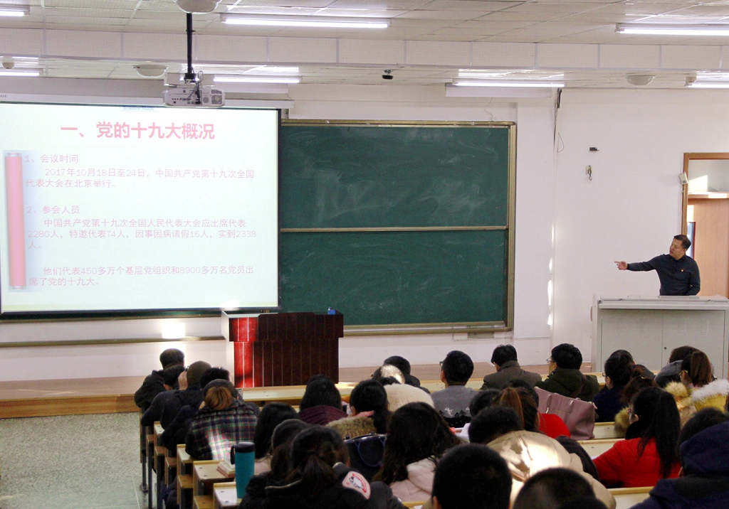 在東區(qū)26教第二階梯教室和25教階梯301教室,校黨的十九大精神宣講團(tuán)成員、哲學(xué)與法學(xué)學(xué)院政治學(xué)與行政學(xué)專業(yè)徐鳳江副教授以《深入推進(jìn)新時代黨的建設(shè)的偉大工程》為題,在講述了新時代全面加強黨的建設(shè)的必要性、黨的十八大以來黨的建設(shè)的重要手段、措施及成就后,著重解讀了新時代黨的建設(shè)的總要求、新時代黨的建設(shè)的八項重點任務(wù)。他指出,學(xué)習(xí)領(lǐng)會黨的十九大精神,要緊緊圍繞習(xí)近平新時代中國特色社會主義思想這個主線,堅持讀原著、學(xué)原文、悟原理,做到學(xué)深悟透。通過學(xué)習(xí)引導(dǎo)全黨自覺維護(hù)習(xí)近平總書記作為黨中央的核心、全黨的核心地位,維護(hù)黨中央權(quán)威和集中統(tǒng)一領(lǐng)導(dǎo)。把師生的思想和行動統(tǒng)一到黨的十九大精神上來,把力量凝聚到黨的十九大確定的各項任務(wù)上來。外國語學(xué)院、音樂與舞蹈學(xué)院全體教職工、學(xué)生黨員及入黨積極分子參加了宣講活動。