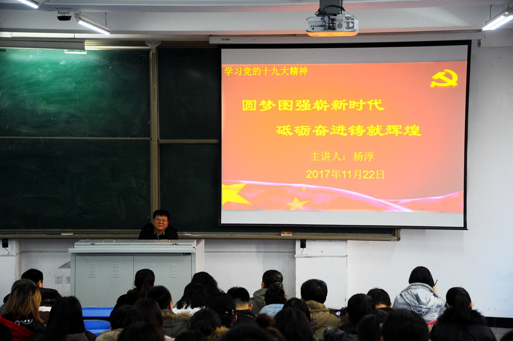 在中區(qū)11教階梯202教室,校黨的十九大精神宣講團(tuán)成員、食品與生物工程學(xué)院黨委書記楊淳副教授以《圓夢圖強嶄新時代 砥礪奮進(jìn)鑄就輝煌》為題,詳細(xì)介紹了黨的十八大以來我國經(jīng)濟(jì)、政治、文化、社會、生態(tài)文明建設(shè)等方面取得的巨大成就,突出強調(diào)了反腐、精準(zhǔn)扶貧、國防和軍隊改革是人民群眾最關(guān)注、最吸引眼球的三大亮點。他指出,黨的十八大以來的五年,以習(xí)近平同志為核心的黨中央高舉中國特色社會主義偉大旗幟,準(zhǔn)確把握中國經(jīng)濟(jì)發(fā)展所處歷史新方位,團(tuán)結(jié)和帶領(lǐng)全國人民為實現(xiàn)中華民族偉大復(fù)興中國夢而努力奮斗、砥礪奮進(jìn),取得了舉世矚目的偉大成就。解決了許多長期想解決而沒有解決的難題,辦成了許多過去想辦而沒有辦成的大事。輕工與紡織學(xué)院全體教職工、學(xué)生黨員及入黨積極分子參加了宣講活動。