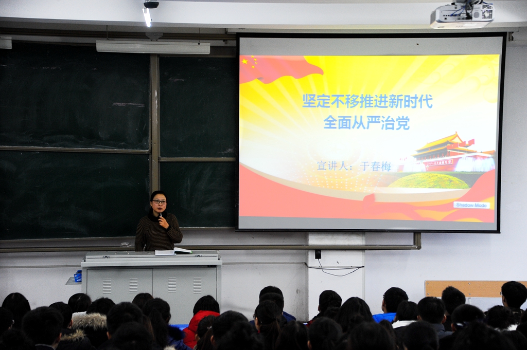 在中區(qū)11教階梯302教室,校黨的十九大精神宣講團(tuán)成員、馬克思主義學(xué)院副院長、碩士生導(dǎo)師于春梅教授以《堅定不移推進(jìn)新時代全面從嚴(yán)治黨》為題,從充分認(rèn)識五年來全面從嚴(yán)治黨的重大成就、明確新時代全面從嚴(yán)治黨的總體要求、全面把握黨的十九大對新時代全面從嚴(yán)治黨的新部署等方面,對黨的十九大精神進(jìn)行了系統(tǒng)、全面、深入的講解。于春梅指出,中國特色社會主義進(jìn)入新時代,面臨新環(huán)境新挑戰(zhàn)新問題,打鐵必須自身硬,因此必須堅定不移推進(jìn)新時代全面從嚴(yán)治黨這一偉大工程,必須進(jìn)一步把我們黨建設(shè)好、建設(shè)強,使我們黨成為堅強有力的領(lǐng)導(dǎo)力量,從而決勝全面建成小康社會、奪取新時代中國特色社會主義偉大勝利。機關(guān)黨委全體教職工參加了宣講活動,化學(xué)與化學(xué)工程學(xué)院全體教職工、學(xué)生黨員及入黨積極分子參加了宣講活動。
