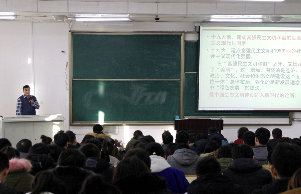 在西區(qū)1教階梯202教室,校黨的十九大精神宣講團(tuán)成員、馬克思主義學(xué)院馬克思主義基本原理教研部主任、博士、碩士生導(dǎo)師王圣禎教授以《認(rèn)真學(xué)習(xí)黨的十九大生態(tài)文明新思想 奮力譜寫美麗中國的龍江華章》為題,從生態(tài)文明建設(shè)新時代的新矛盾與新目標(biāo)、生態(tài)文明建設(shè)新時代的新使命、奮力譜寫美麗中國的龍江華章、美麗中國與大學(xué)生的歷史擔(dān)當(dāng)?shù)确矫孢M(jìn)行了解讀。他指出,實現(xiàn)美麗中國偉大夢想,一要戰(zhàn)勝生態(tài)挑戰(zhàn)的偉大斗爭,二要建設(shè)生態(tài)馬克思主義政黨的偉大工程,三要推進(jìn)中國特色社會主義生態(tài)文明建設(shè)偉大事業(yè)。緊密結(jié)合省情,在立足得天獨厚的龍江自然資源優(yōu)勢中搶占綠色發(fā)展制高點,促進(jìn)綠色發(fā)展。建設(shè)美麗中國更需要大學(xué)生的歷史擔(dān)當(dāng)。建筑與土木工程學(xué)院、機電工程學(xué)院全體教職工、學(xué)生黨員及入黨積極分子參加了宣講活動。
