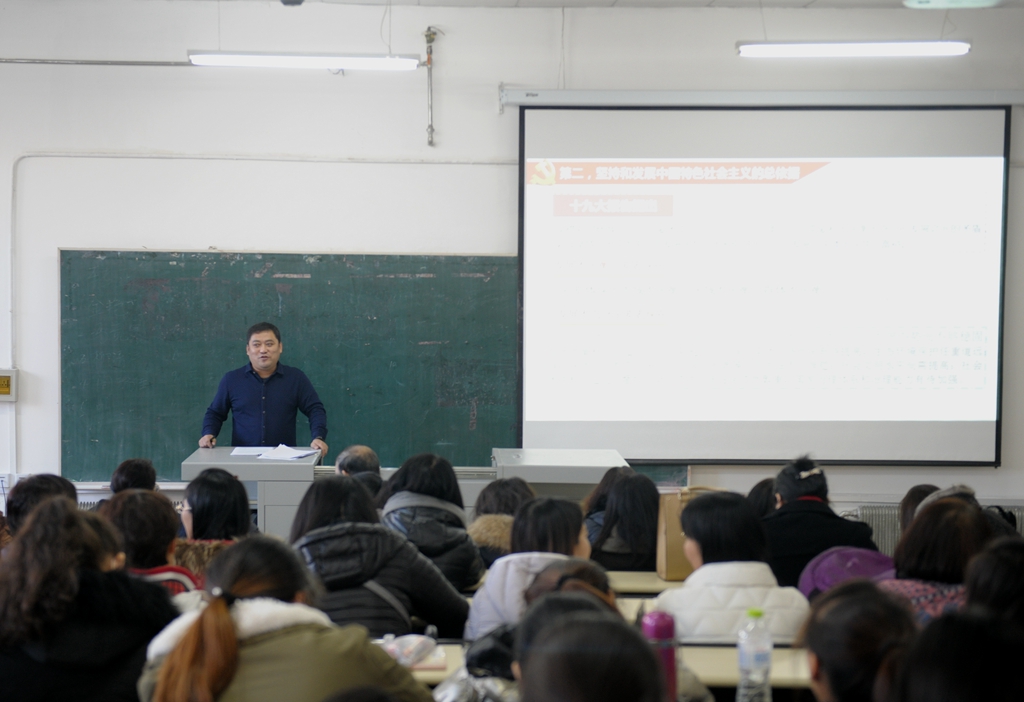 在西區(qū)1教階梯203教室,校黨的十九大精神宣講團(tuán)成員、馬克思主義學(xué)院中國近現(xiàn)代史綱要教研部主任、碩士生導(dǎo)師張春波副教授以《新思想引領(lǐng)新時代 新使命開啟新征程》為題,從新時代、新矛盾——進(jìn)行偉大斗爭,新理論、新思想——建設(shè)偉大工程,新任務(wù)、新舉措——推進(jìn)偉大事業(yè),新使命、新征程——實現(xiàn)偉大夢想等四個方面闡釋了黨的十九大的“新”。他指出,只有進(jìn)行新的偉大斗爭才能開創(chuàng)新時代,解決新矛盾。只有以馬克思主義中國化最新成果——習(xí)近平新時代中國特色社會主義思想為行動指南,才能建設(shè)新的偉大工程。他分析了推進(jìn)中國特色社會主義偉大事業(yè)的新任務(wù)和新舉措,提出在實現(xiàn)中華民族偉大復(fù)興中國夢的新征程中廣大師生的使命擔(dān)當(dāng)。理學(xué)院、應(yīng)用技術(shù)學(xué)院全體教職工、學(xué)生黨員及入黨積極分子參加了宣講活動。
