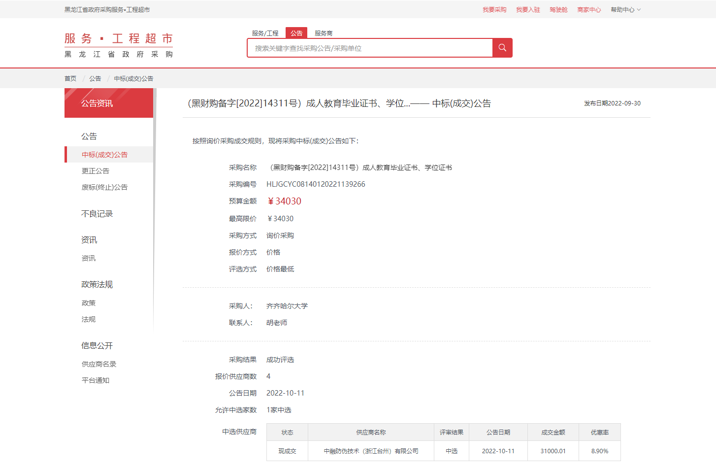 采購名稱(黑財購備字[2022]14311號)成人教育畢業(yè)證書、學位證書