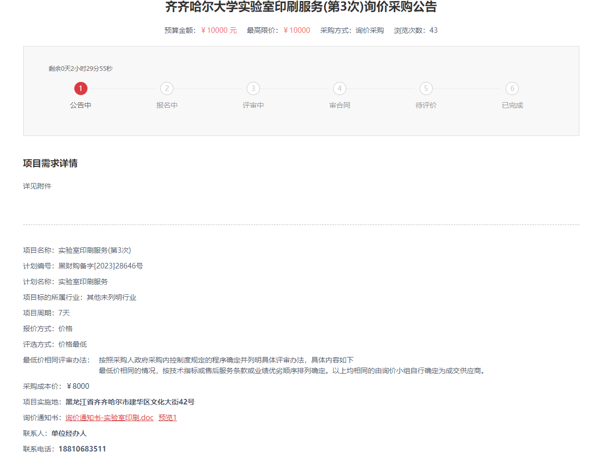 下一條:齊齊哈爾大學(xué)實(shí)驗(yàn)室印刷服務(wù)(第2次)詢價(jià)采購公告(轉(zhuǎn)自黑龍江省政府采購網(wǎng))