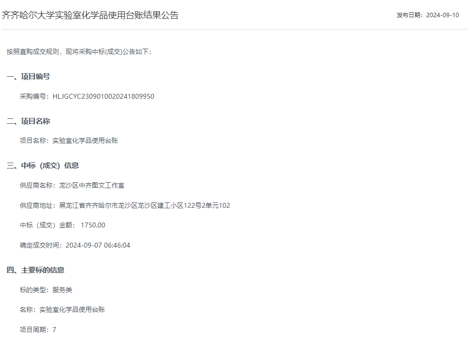 下一條:齊齊哈爾大學(xué)實驗室化學(xué)品庫存臺賬結(jié)果公告(轉(zhuǎn)自黑龍江省政府采購網(wǎng))
