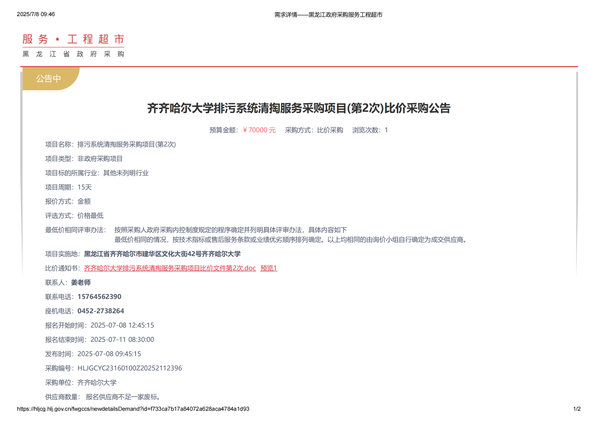 下一條:齊齊哈爾大學(xué)排污系統(tǒng)清掏服務(wù)采購項目比價采購公告(一次廢標(biāo))(轉(zhuǎn)自黑龍江省政府采購網(wǎng))