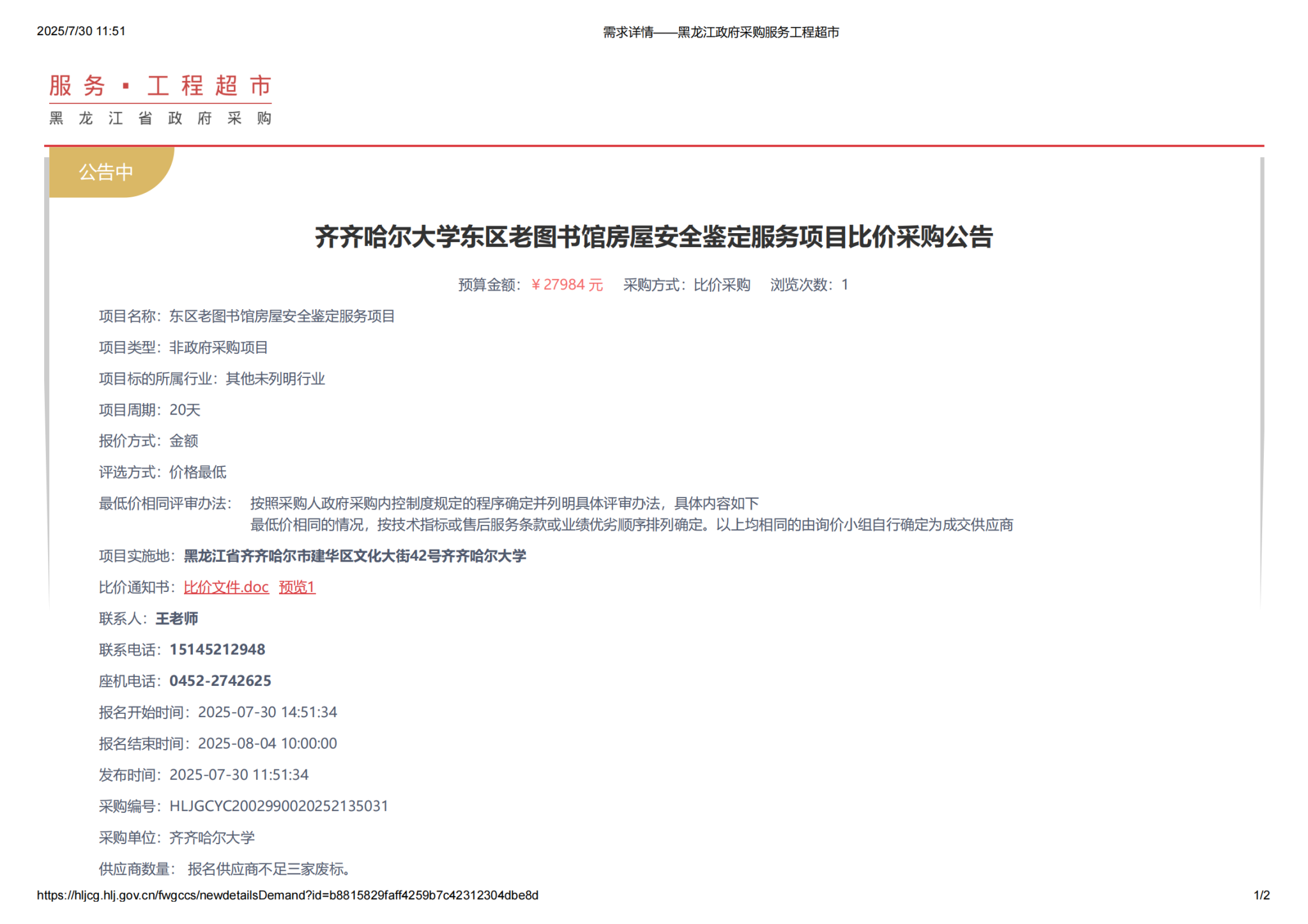 下一條:齊齊哈爾大學(xué)危險(xiǎn)化學(xué)品暫存站維修(增加)項(xiàng)目比價(jià)采購公告(轉(zhuǎn)自黑龍江省政府采購網(wǎng))