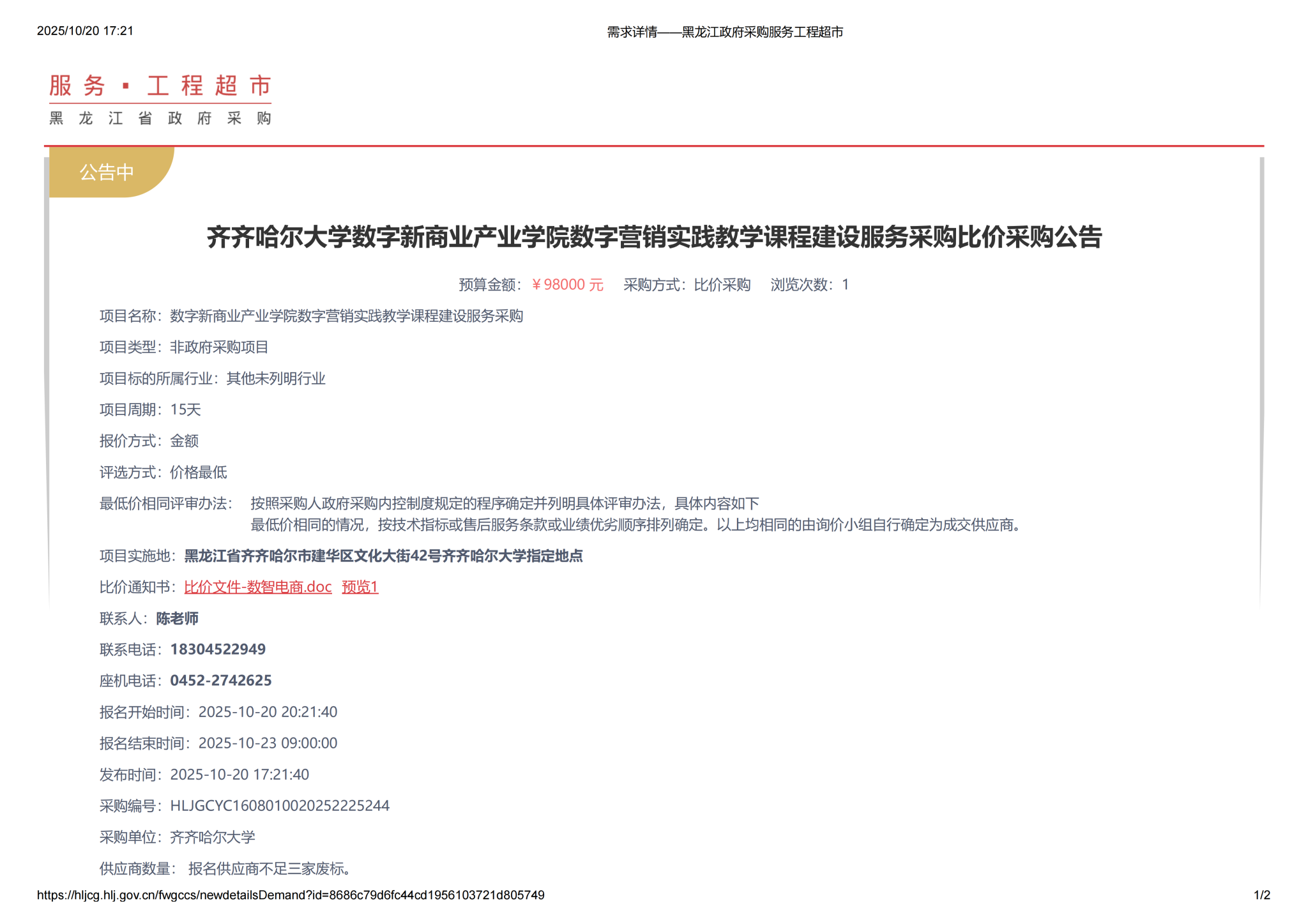 下一條:齊齊哈爾大學數(shù)字新商業(yè)產(chǎn)業(yè)學院數(shù)智電商實踐教學課程建設(shè)服務(wù)采購比價采購公告(轉(zhuǎn)自黑龍江省政府采購網(wǎng))