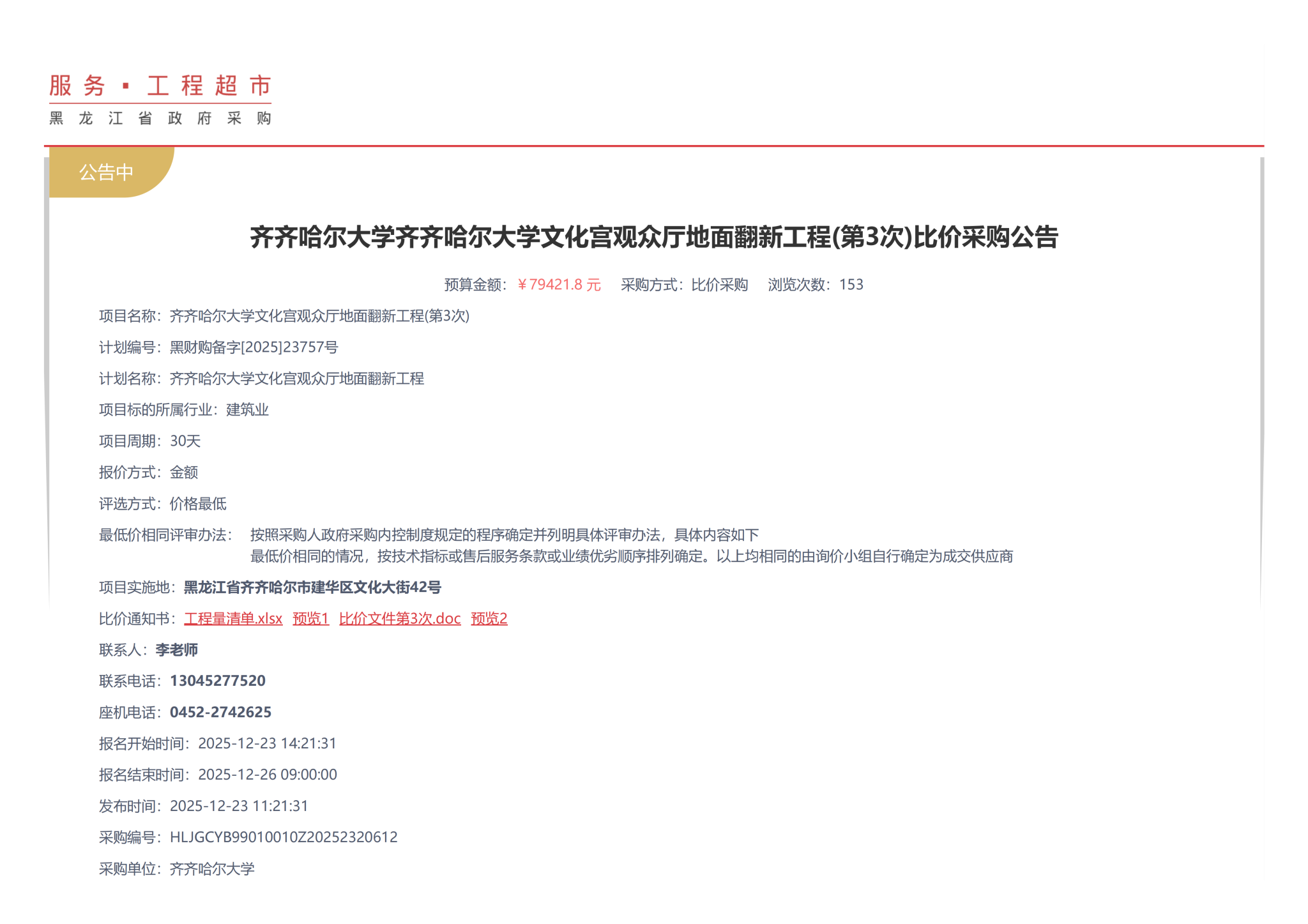 下一條:2025年齊齊哈爾大學(xué)“走讀式”談話室維修改造項(xiàng)目(第3次)比價(jià)采購(gòu)公告(轉(zhuǎn)自黑龍江省政府采購(gòu)網(wǎng))