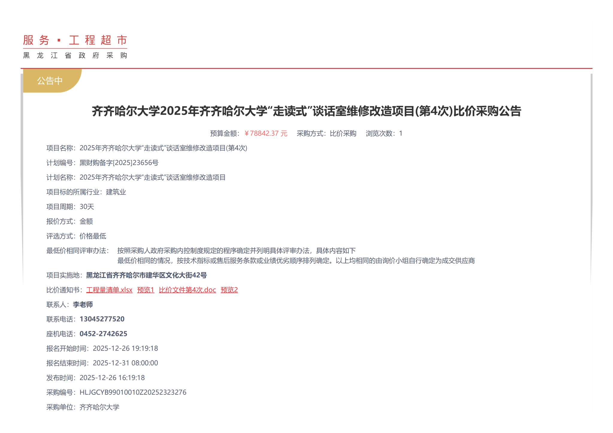 下一條:齊齊哈爾大學(xué)文化宮觀眾廳地面翻新工程(第3次)結(jié)果公告(轉(zhuǎn)自黑龍江省政府采購網(wǎng))
