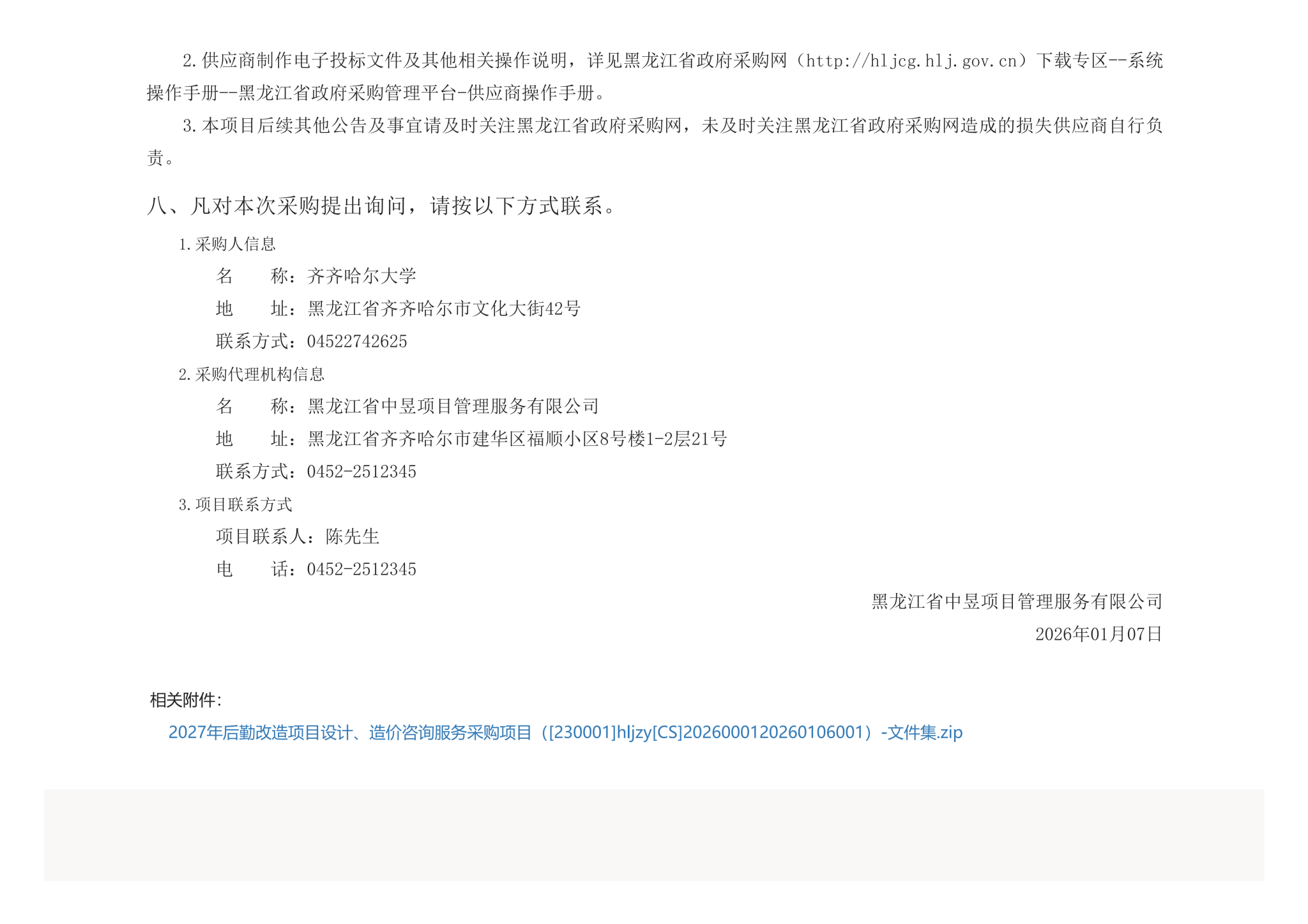上一條:齊齊哈爾大學(xué)2027年后勤改造項(xiàng)目設(shè)計(jì)、造價(jià)咨詢(xún)服務(wù)采購(gòu)項(xiàng)目采購(gòu)更正公告(第一次)(轉(zhuǎn)自黑龍江省政府采購(gòu)網(wǎng))