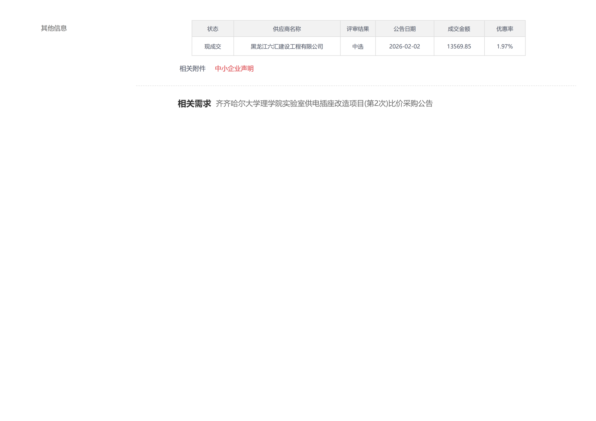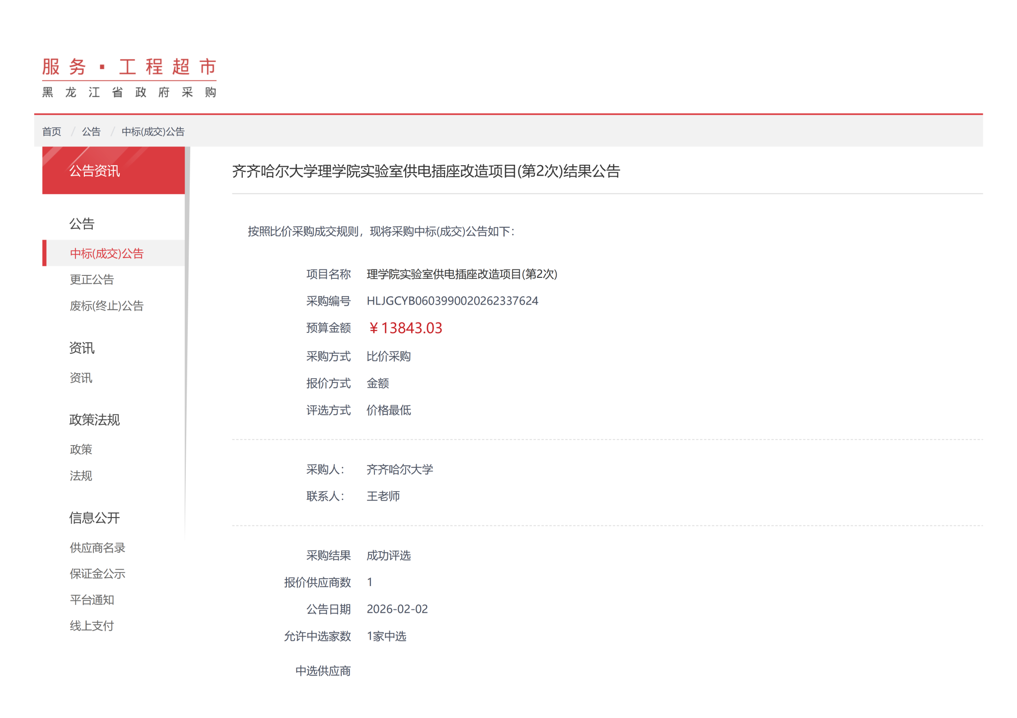下一條:齊齊哈爾大學(xué)理學(xué)院實(shí)驗(yàn)室供電插座改造項(xiàng)目(第2次)比價采購公告(轉(zhuǎn)自黑龍江省政府采購網(wǎng))