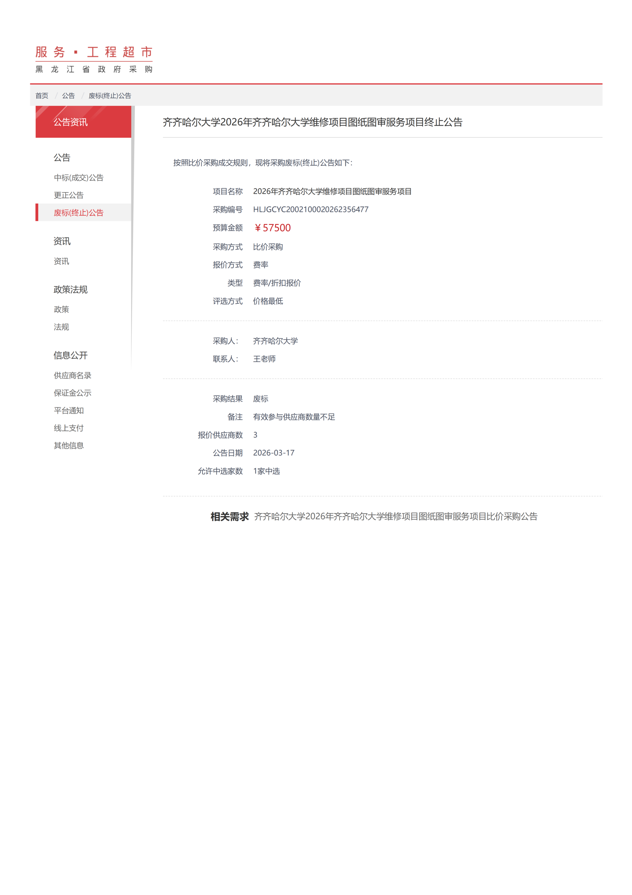上一條:2026年齊齊哈爾大學(xué)維修項(xiàng)目圖紙圖審服務(wù)項(xiàng)目(第2次)比價(jià)采購公告(轉(zhuǎn)自黑龍江省政府采購網(wǎng))