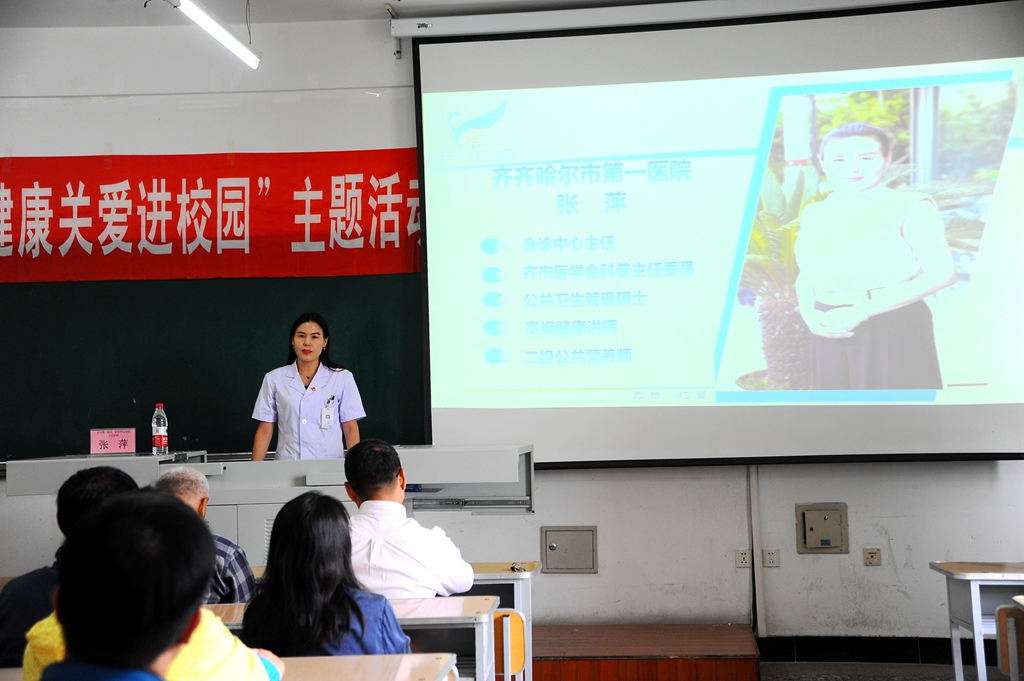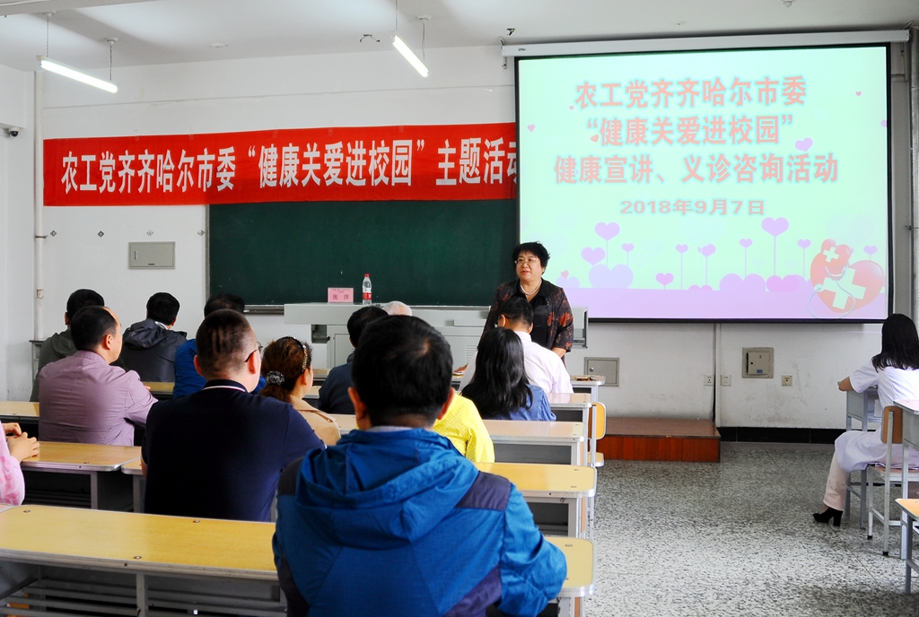 9月7日下午,農(nóng)工黨齊齊哈爾市委“健康關(guān)愛(ài)進(jìn)校園”健康宣講、義診咨詢活動(dòng)在我校中區(qū)主樓312教室舉辦,來(lái)自齊齊哈爾市第一醫(yī)院的專家為我校師生開(kāi)展健康咨詢和義診活動(dòng)。農(nóng)工黨齊齊哈爾市委會(huì)副主委兼秘書(shū)長(zhǎng)陳曦,農(nóng)工黨齊齊哈爾市委會(huì)副主委、我校輕工與紡織學(xué)院院長(zhǎng)鄭永杰參加了活動(dòng)。活動(dòng)由校黨委宣傳統(tǒng)戰(zhàn)部部長(zhǎng)王曉梅主持。