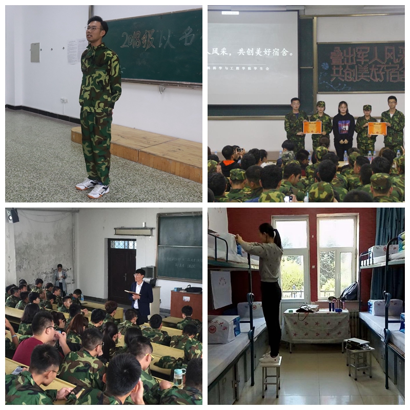 為了豐富新生軍訓期間的文化生活,文學與歷史文化學院開展了“緣聚文史 以名會友 ”活動,大一新生們紛紛自告奮勇地走上講臺介紹自己,活動中,同學盡顯多才多藝,青春洋溢,有的同學用歌聲介紹自己,有的同學用家鄉(xiāng)話介紹自己,更有來自西藏的同學一展風采,為大家?guī)砹霜毦呙褡逄厣母枨?,大家用真摯的語言充分表達了對大學生活的憧憬與期待;為檢驗軍訓階段訓練成果,提高學生內務整理水平,9月6日18:30材料科學與工程學院在1教J403室舉辦“疊出軍人風采,共創(chuàng)美好宿舍”疊軍被比賽,同學們在規(guī)定的時間內高質量地完成了任務,壓、量、切、扣、修一氣呵成,技術嫻熟、動作流暢,充分展現(xiàn)了軍訓中內務衛(wèi)生的訓練成果,為今后舍務管理打下了良好的基礎;為了讓新生在軍訓中學習到部隊軍人身上嚴守軍紀、令行禁止的紀律意識,提高新生對學校規(guī)章制度的認識和了解,8月24日—25日,機電工程學院組織參訓新生進行了教育管理文件學習,通過輔導員高福生老師的細致講解,使大一新生對學校的相關規(guī)定有了全面的認識,為新生們如何珍惜寶貴的大學時光指明了方向;理學院強化了新生早操訓練,學院安排退伍復學的學生擔任早訓教官,早訓教官們犧牲個人時間利用早操時間帶領大家反復練習白天的軍事訓練科目,使學院的整體軍事訓練效果有了明顯提高。