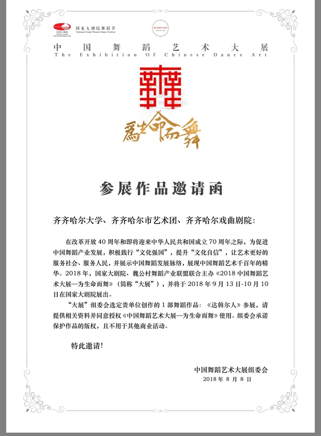 在改革開放40周年和即將迎來中華人民共和國成立70周年之際,為促進(jìn)中國舞蹈產(chǎn)業(yè)發(fā)展,積極踐行“文化強國”,提升“文化自信”,展現(xiàn)中國舞蹈藝術(shù)千百年的精華,2018年9月13日-10月10日,由國家大劇院、魏公村舞蹈產(chǎn)業(yè)聯(lián)盟聯(lián)合主辦的《2018中國舞蹈藝術(shù)大展—為生命而舞》,在國家大劇院展出。大展組委會選定由齊齊哈爾大學(xué)和齊齊哈爾市戲曲劇院聯(lián)合打造的大型風(fēng)情音畫《達(dá)斡爾人》參展。