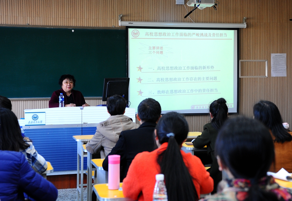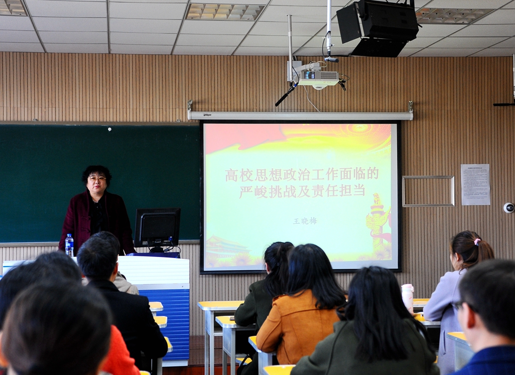 王曉梅以《高校思想政治工作面臨的嚴(yán)峻挑戰(zhàn)及責(zé)任擔(dān)當(dāng)》為題,對(duì)高校思想政治工作面臨的形勢(shì),存在的主要問(wèn)題以及教師在思想政治工作中的責(zé)任擔(dān)當(dāng)進(jìn)行詳細(xì)闡述。王曉梅強(qiáng)調(diào),高校教師作為人才培養(yǎng)的重要主體,不僅要不斷強(qiáng)化自身開(kāi)展思想政治工作的責(zé)任意識(shí),創(chuàng)新思想政治工作方式方法,更要做到時(shí)刻提高警惕,積極提升自身政治素養(yǎng)。青年教師要堅(jiān)守以德立身的行為準(zhǔn)則,將思想政治教育滲透到日常課堂教學(xué)中去,不斷加強(qiáng)學(xué)生的政治覺(jué)悟和政治素養(yǎng)。