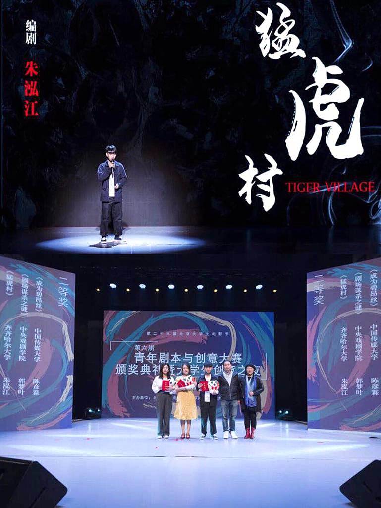 4月23日下午,第二十六屆北京大學生電影節(jié)第六屆青年劇本與創(chuàng)意大賽頒獎典禮在北京師范大學北國劇場舉行,我校文學與歷史文化學院戲劇影視文學專業(yè)162班朱泓江同學創(chuàng)作的劇本《猛虎村》脫穎而出,榮獲原創(chuàng)劇情類劇本二等獎。