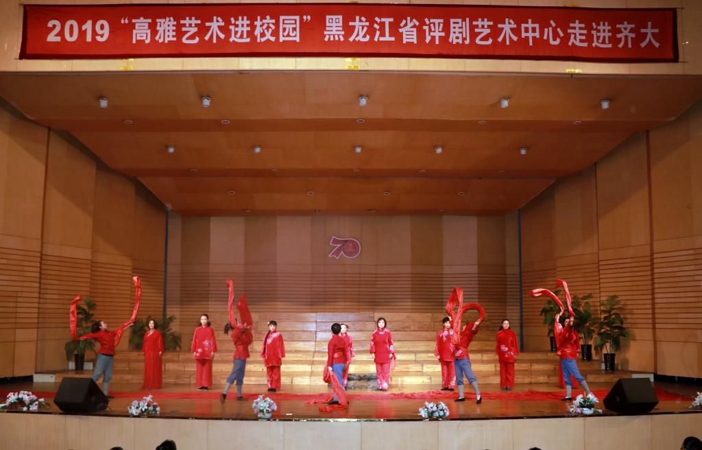 10月16日下午,2019年“高雅藝術(shù)進(jìn)校園”黑龍江省評(píng)劇藝術(shù)中心走進(jìn)齊大專場(chǎng)文藝演出在我校音樂(lè)廳舉行。省評(píng)劇藝術(shù)中心的40余名演職人員,用他們的精湛技藝為我校師生送來(lái)了一場(chǎng)高水平的國(guó)粹藝術(shù)盛宴。我校1000余名師生共同欣賞了演出。