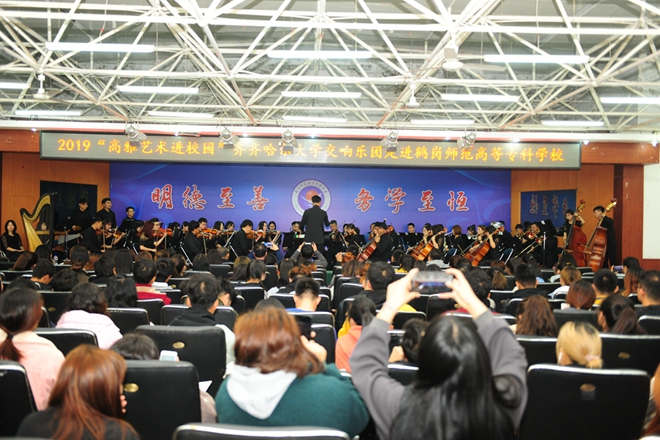 在“不忘初心、牢記使命”主題教育深入開展之際,10月14日至18日,受黑龍江省教育廳、文化和旅游廳、財(cái)政廳的委托,我校黨委宣傳部副部長何強(qiáng),音樂與舞蹈學(xué)院副院長殷進(jìn)良,帶領(lǐng)齊齊哈爾大學(xué)交響樂團(tuán)70余名師生,赴鶴崗師范高等專科學(xué)校、黑龍江冰雪體育職業(yè)學(xué)院、哈爾濱應(yīng)用職業(yè)技術(shù)學(xué)院、哈爾濱科學(xué)技術(shù)職業(yè)學(xué)院,開展了四場“高雅藝術(shù)進(jìn)校園”專場演出,受到四所高校2000余名師生的熱烈歡迎和高度贊譽(yù)。