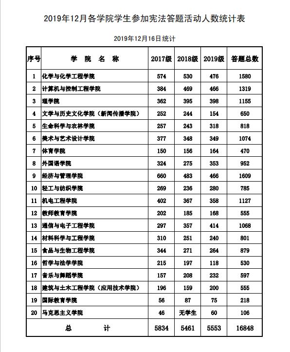 三、廣泛參與。本次活動(dòng)以2019、2018、2017級(jí)(大一至大三)的學(xué)生為主,學(xué)生使用手機(jī)掃描二維碼,積極參加了教育部“普法網(wǎng)”憲法答題活動(dòng)。匯總各學(xué)院黨委上報(bào)的學(xué)生答題情況數(shù)據(jù)顯示,本次參加憲法答題的學(xué)生總?cè)藬?shù)為16848人,占全校2019、2018、2017級(jí)學(xué)生總數(shù)的91.37%,達(dá)到了上級(jí)部門(mén)的要求,收到了良好的效果。