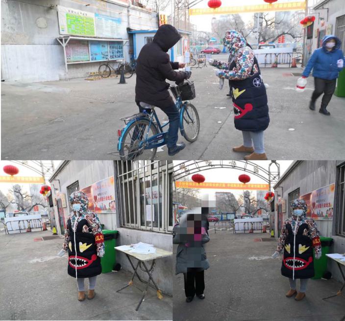 “我的本職工作就是教書育人,在重大疫情面前,我作為教師,作為黨員,應(yīng)該為我的學(xué)生樹立榜樣,初心使命不是說出來的,而是真刀真槍干出來的,這些都是我應(yīng)該做的”。2月7日,馬克思主義學(xué)院教師高學(xué)軍報名參加了由齊齊哈爾市建華區(qū)王仔花苑臨時社區(qū)黨委組成的黨員志愿隊,上圖是她第一次值崗被安排在解放門醫(yī)院的坤順小區(qū)協(xié)助防疫值班的情景。她每隔2至3天就會輪一次崗,主要負責(zé)為出入小區(qū)人員進行體溫測量、出入信息登記等工作。