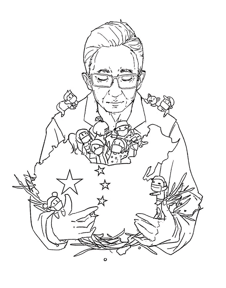 創(chuàng)作簡介:疫情嚴(yán)重,我們學(xué)生無法支援一線,只有做好預(yù)防,小心抑疫!作品主體是鐘老和醫(yī)護(hù)人員的形象,他們?yōu)榱俗鎳恢迸^戰(zhàn)在一線崗位,為全國努力,保護(hù)中國人民的生命安全。中國加油!武漢加油!