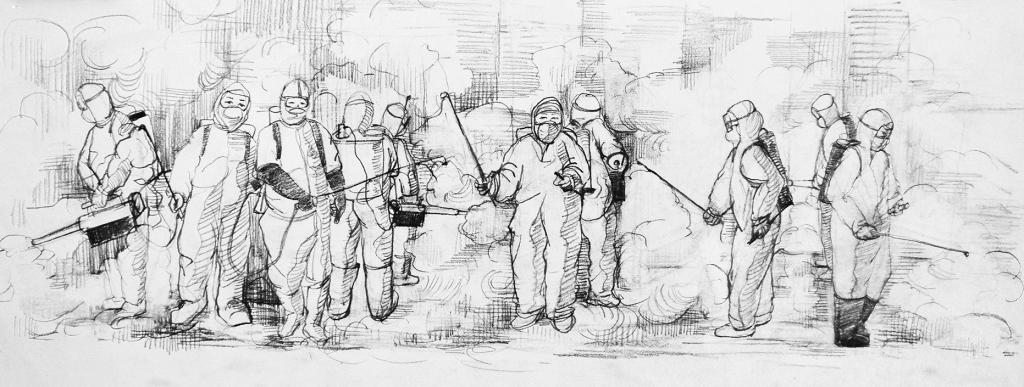 創(chuàng)作簡介:一群身著防護(hù)服的志愿者們在街道上“地毯式”噴灑消毒液,為民眾筑起一道防疫的屏障之墻。