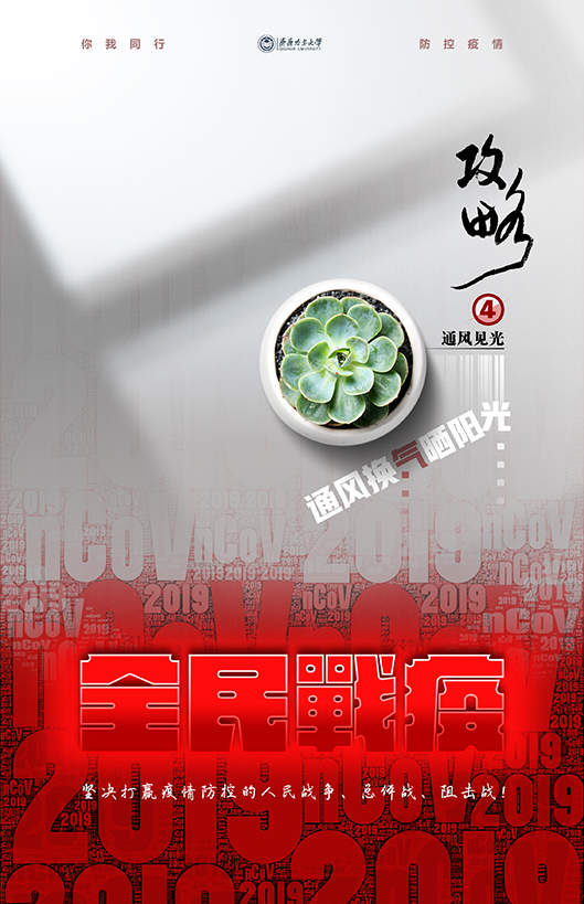 設(shè)計(jì)簡介:以小面積的紅色與大面積的灰白色做對比,2019nCoV作為背景基礎(chǔ)圖形要素,揭示了目前防疫工作的嚴(yán)峻性。招貼以“全民戰(zhàn)疫”為系列設(shè)計(jì);告知普通民眾在居家隔離期間應(yīng)該重視的日常問題。這一幅為通風(fēng)見光,展現(xiàn)了普通民眾日常生活的細(xì)節(jié)。定時開窗通風(fēng)換氣,沐浴陽光。關(guān)愛個人和家庭成員健康的同時,也同樣為全國人民戰(zhàn)勝疫情做出了自己的貢獻(xiàn)!