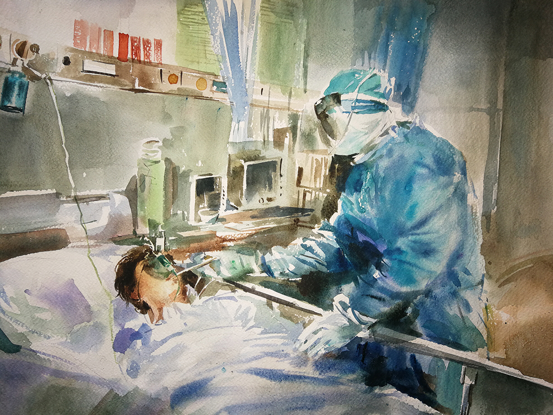《抗疫英雄日記——送親人》水彩 馬濤