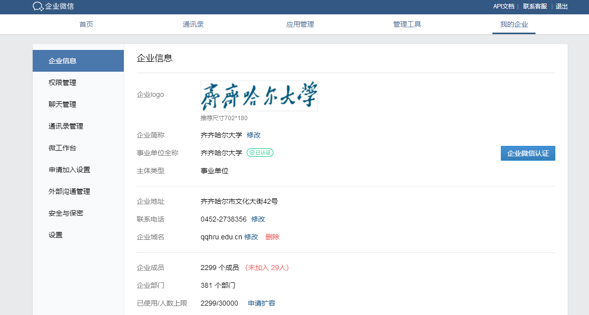 完成企業(yè)微信平臺的搭建。從2月11日開始,網絡信息中心開始搭建“齊齊哈爾大學企業(yè)微信”平臺,由于企業(yè)微信以學校的基本組織結構為基礎單位,每名教師都要在組織結構中落實到科室、系部等,因此,落實任務人員多、工作量很大,網絡信息中心設置了孫涌泉、祝文生、孫家良、李玲玲等4名系統管理員,學校各單位設置1名管理員對本單位人員進行邀請、加入、分類、管理,同時在線開展使用答疑、操作培訓、技術問題處理。在所有同志的配合下,用了三天時間,將2299名教職工加入企業(yè)微信平臺,為下一步智慧校園建設和信息化應用工作奠定了基礎。制作企業(yè)微信視頻會議教程文檔加入微云盤共享,為各單位使用企業(yè)微信召開遠程視頻會議提供方便。